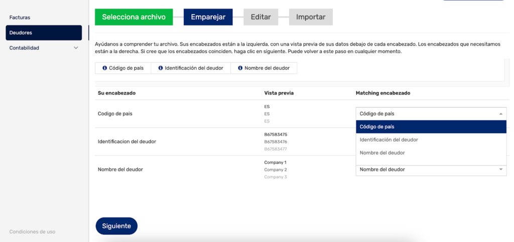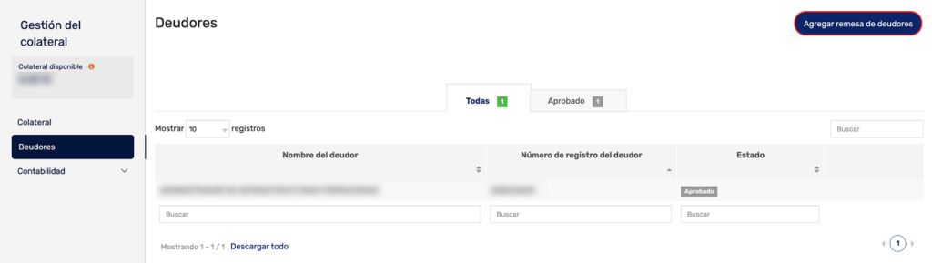 En la sección «Deudores», utiliza el botón «Subir remesa» para cargar el listado de empresas con las que operas.