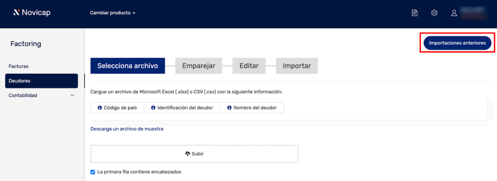Si quieres ver el registro de todas las remesas de deudores que has subido previamente, puedes hacerlo haciendo clic en la sección DeudoresAgregar remesa deudor y, dentro de la pantalla de subida de la remesa, hacer clic en “Importaciones anteriores”.